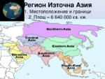 Местоположение и граници, площ - 6 640 000 кв.км., релеф, Японски острови, остров Сахалин, Курилски острови, Голяма китайска равнина, Тайван...