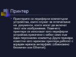 Принтерите са периферни компютърни устройства, които служат за отпечатване на документи, които могат да включат текст или изображения. Повечето принтери се използват като периферни устройва,прикачени с кабел само към един персонален компютър...