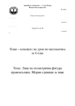 План-конспект по методика на математиката за 1 - 4 клас. Тема: Лице на геометрична фигура правоъгълник. Мерни единици за лице...