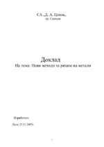 Описание на новите методи за рязане на метали: Свръхскоростно рязане, Скоростно и силово шлифоване, Електроискрово обработване, Ултразвуково обработване, Лазерно обработване, Плазмено обработване, Електрохимична обработка.