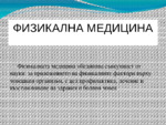 Физикалната медицина обединява съвкупност от науки за приложението на физикалните фактори върху човешкия организъм, с цел профилактика, лечение и възстановяване на здравия и болния човек...