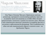 Сър Чарлс Спенсър Чаплин е британски актьор, режисьор, сценарист и композитор работил през по - голямата част от живота си в САЩ. Една от най - креативните личности в ерата на нямото кино, Чаплин е най - известният актьор в ранните ...