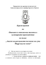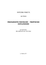 Курсовата работа е на тема какво представлява рекламното послание, какво е неговото предназначение, какво е тон и стил, сътворяване на рекламния текст, писане за печатни и електронни медии...