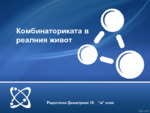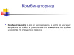 Комбинаториката е дял от математиката, в който се изучават въпросите за избор и разполагане на елементите на крайни множества по определени правила...
