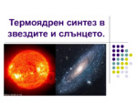 Звездата е огромно газово кълбо с голяма маса, което под влияние на гравитационните сили се стреми да се свие максимално много, и в резултат на това се повишава температурата в центъра дотолкова, че възниква ядрен синтез - два водородни атома се сливат...