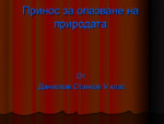 Принос за опазване на околната среда1.ГоритеЗа да опазим горите трябва да:Да спрем изсичането на дърветата и застрояването на площите.Да не предизвикваме умишлени пожари.Да не изхвърляме различни отпадъци в горите....