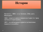 Зараждане и развитие на волейбола. Началото – 1895 г. в гр. Холиоок, САЩ, щата Масачузетс. 1896 г. играта е демонстрирана за първи път пред публика в Спрингфийлд...