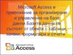 Microsoft Access е прилoжение за организиране и управление на база данни. Базите данни се състоят от обекти – таблици, заявки, формуляри и отчети...