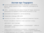 Англия при Тюдорите. Късното Средновековие в Англия завършва с "Войната на розите" между родовете Йорк и Ланкастер, претенденти за престола. 1485 г. – на престола се възкачва Хенри VII Тюдор: начало на династията на Тюдорите, управлявала Англия до...