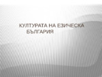 Презентацията е за ученици от 5-ти клас. Езическият етап от изграждането на старобългарската култура обхваща времето от създаването на българската държава до средата на IX в. Културата на езическа България се оформила под въздействието на различни...