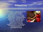 Презентацията е за шоколад. Тя включва състава на шоколада, съхранението, окачествяване, вкус и аромат, форма и цвят, лабораторното окачествяване, опаковка, маркировката...