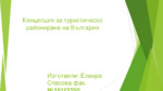 Концепцията за туристическо райониране на България е разработена в периода февруари-юли 2014 г. от екип на Националния център за териториално развитие (НЦТР), в изпълнение на обществена поръчка от Министерството на туризма (МТ)...