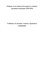 Реферат по история на българското училище традиции и иновации (1878-1944). Подходящ за студенти по история. Темата е Учебникът по история – същност, функции и съдържание...