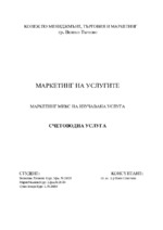 Подробно описание на маркетинговите услуги.Маркетинг микс.Фактори,които влияят на маркетинга.Възприемане на счетоводната услуга.Ефективност на маркетинговите решения...